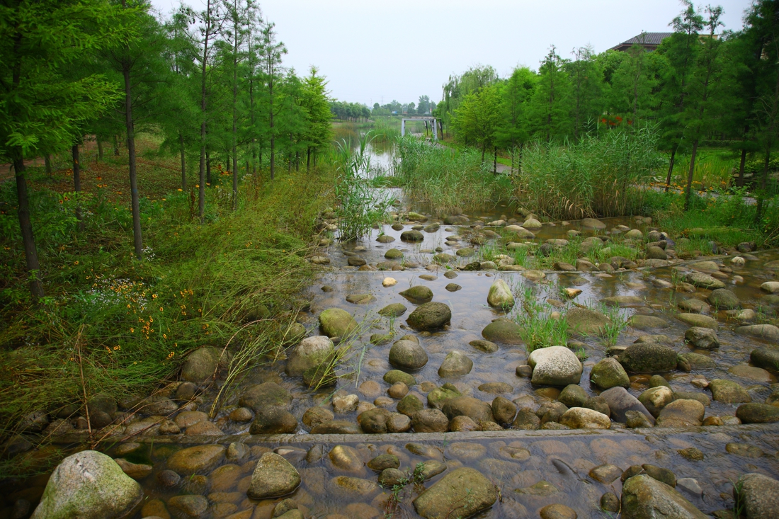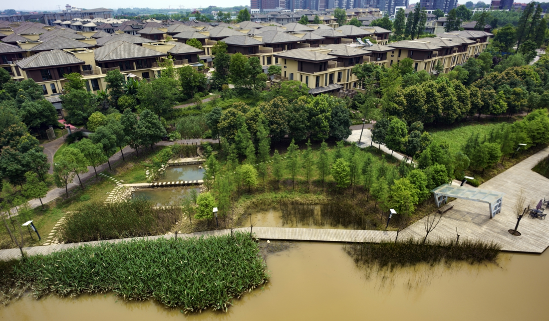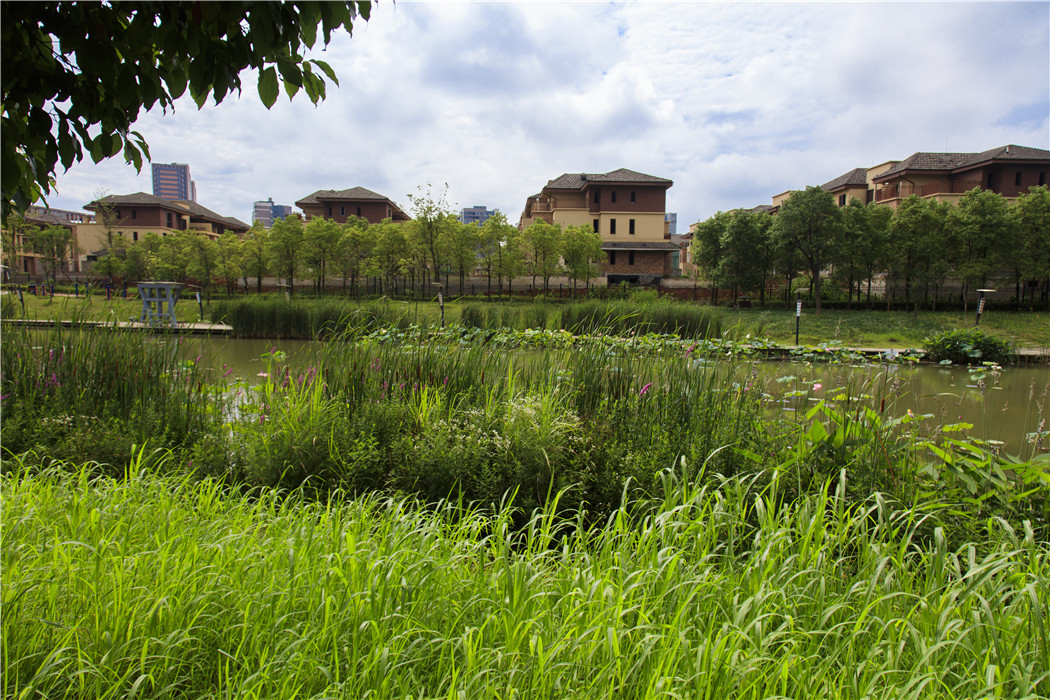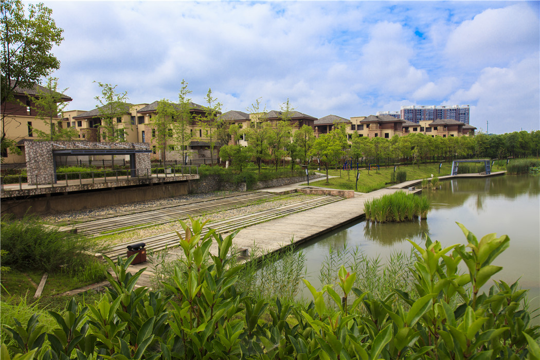 A water-based ecological infrastructure (EI) will organize the town. The EI is designed around the existing water systems and land forms. The key functions are to retain and clean stormwater. Different rainfall amounts are simulated to determine the area and pattern of the pond/wetland system so that all stormwater will be retained on site and will have little impact on the regional water system. This will reduce the construction costs of underground drainage pipes and preserve or create habitat for native wildlife and wetland vegetation such as lotus, wild rice stem, water chestnut, water caltrop, and Chinese arrowhead.