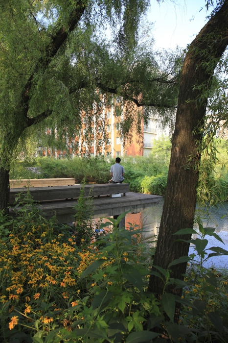 The gully in the middle of the site is restored and designed to be falling water, where the main spaces for activities are located nearby. It is not only the natural separation between living zone to the east and studying zone to the west, but also a connector between artificial environment and the natural environment.