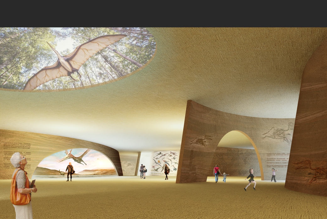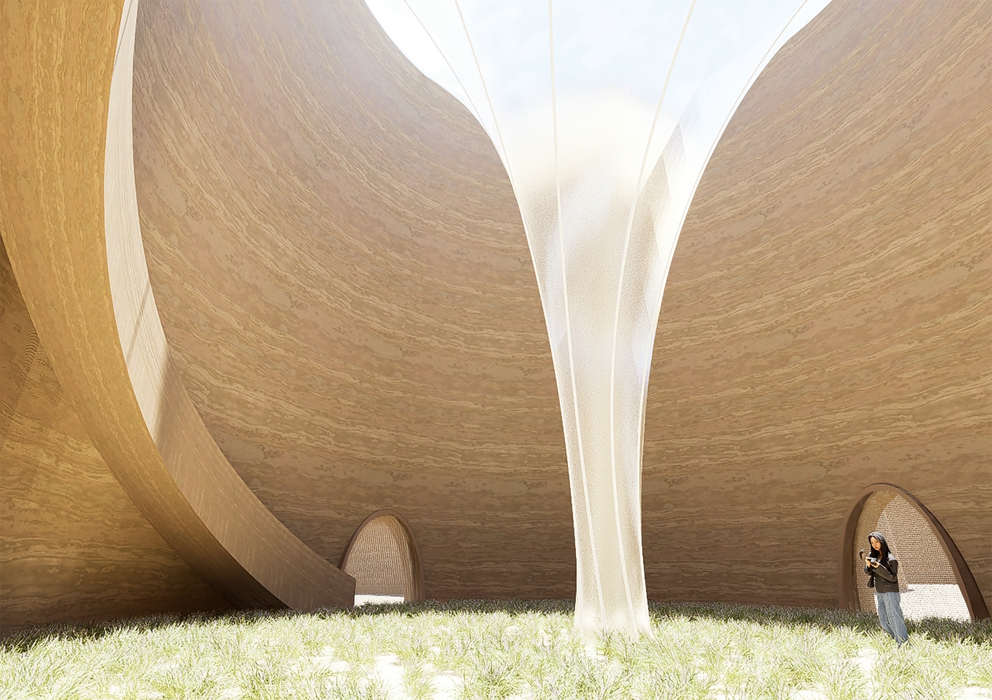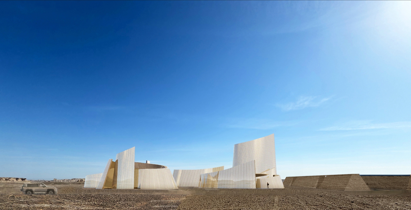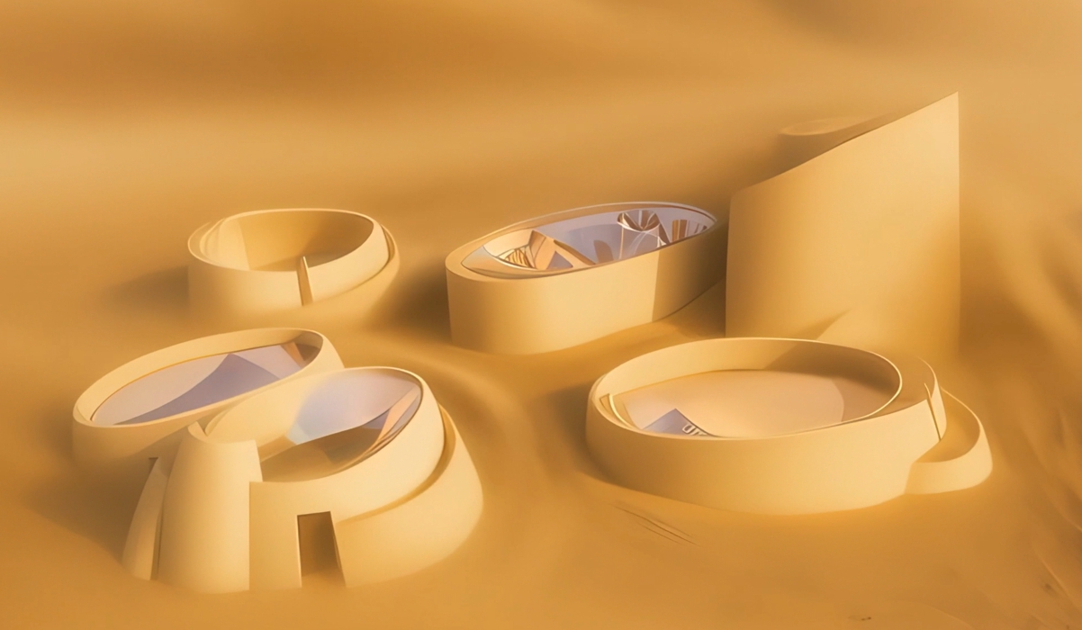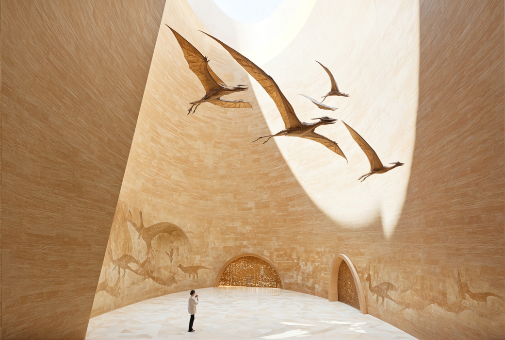The museum’s eco-adaptive design integrates scientific research, education, and eco-tourism while pioneering strategies for climate resilience in arid zones. Embedded underground, the main exhibition spaces maintain stable temperatures and avoid sandstorm abrasion. Above ground, spiraled shell-like structures—evocative of fossilized dinosaur eggs—anchor the site visually and aerodynamically, deflecting winds and channeling airflow to reduce pressure by 40%.
