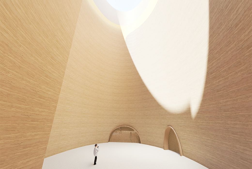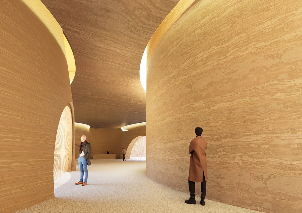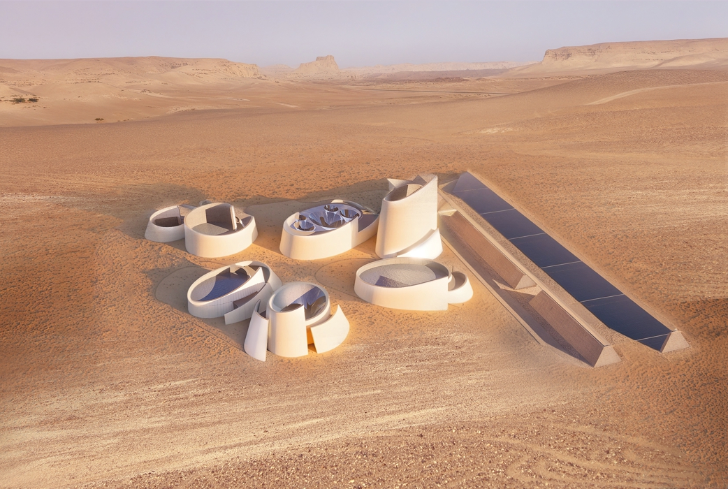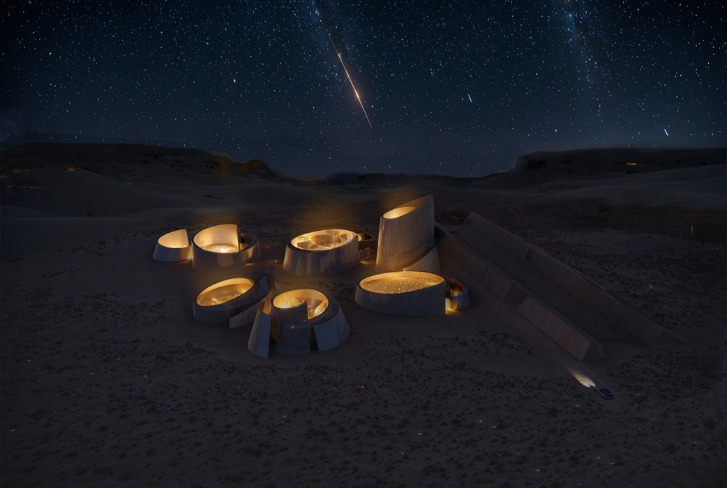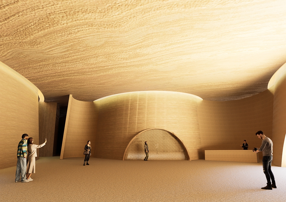 The museum’s eco-adaptive design integrates scientific research, education, and eco-tourism while pioneering strategies for climate resilience in arid zones. Embedded underground, the main exhibition spaces maintain stable temperatures and avoid sandstorm abrasion. Above ground, spiraled shell-like structures—evocative of fossilized dinosaur eggs—anchor the site visually and aerodynamically, deflecting winds and channeling airflow to reduce pressure by 40%.