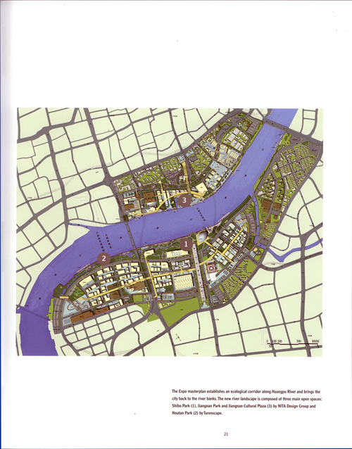 The Expo master plan establishes an ecological corridor along Huangpu River and brings the city back to the river banks. The new river landscape is composed of three main open spaces: Shibo Park (1), Jiangnan Park and Jiangnan Cultural Plaza (3) by NITA Design Group and Houtan Park (2) by Turencape.