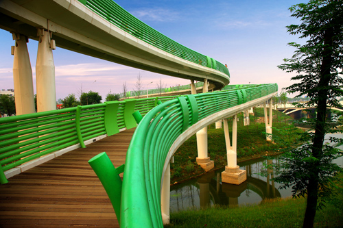流云水袖桥是城市景观元素的功能和形式完美结合的典范。它通过简单而优美的市政元素,将复杂的城市功能和空间结构整合在一起。桥位于江苏睢宁县徐宁路,跨越横穿城市的快速干道和多个水系,连接县城核心区的广场和马路对面森林公园。主桥全长635米,总建设长度869米,总面积2700平方米。4道辅桥总长242米,桥面宽度2.5米至9米之间不等,桥面坡度0.4%至12.6%之间。流云水袖桥过路面保证净高4.5米。