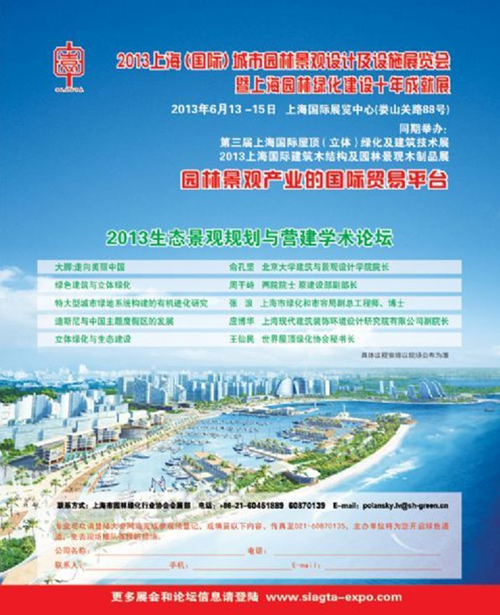 2013上海(国际)城市园林景观绿化设计及设施展览会暨上海园林绿化建设十年成就展由上海市园林绿化行业协会联手上海市绿化和市容管理局、上海市房地产行业协会、上海市勘察设计行业协会、上海市市政工程行业协会、上海市城市规划行业协会和全国十三个主要省市园林景观协会共同举办的2013上海(国际)城市园林景观绿化设计及设施展览会暨上海园林绿化建设十年成就展将于2013年6月13-15日在上海国际展览中心隆重举行。始于2003年的上海景观展是国内历史最悠久、规模最大、影响最广的园林景观规划设计行业盛会,获得业界人士高度评价。