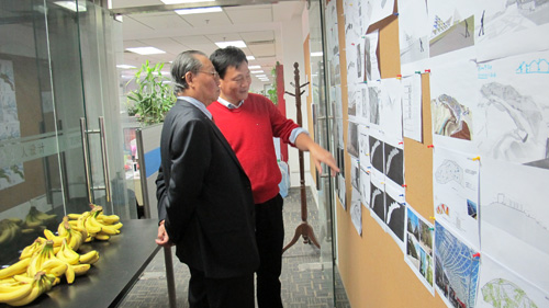 讲座当天,鲍教授在北大建筑与景观设计学院院长、土人设计首席设计师俞孔坚教授的热情陪同下参观了土人设计以及土人设计的各个分院所。