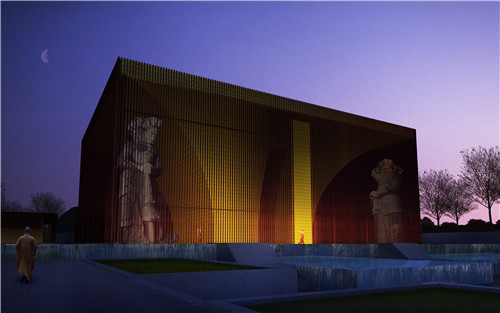 建筑外饰面采用现代建筑材料格栅及面砖,抛弃了传统寺庙的挑梁飞檐的建筑形式,采用平顶实心,四周包围金属格栅的建筑形式,体现了天地的方正及佛家的虚无。建筑色彩上延续传统佛家建筑的颜色:黄色、红色和黑色。
