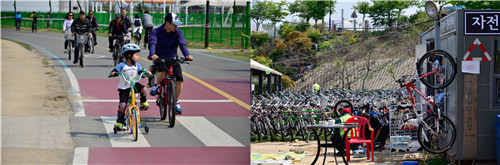 汝矣岛公园隔路相望的汉江滨水公园,土人设计师通过租赁自行车方式进行游览,,一路领略复兴汉江的特性化产业和沿河风光。