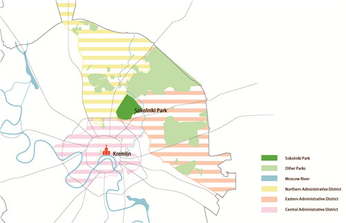 Sokolniki公园场地面积为515.7公顷,是莫斯科访客量最多的公园,距离克里姆林宫 6公里,靠近中央行政区1.2 公里,其中拥有229.2公顷的特殊自然保护区连接著城市东北方向的国家公园,每年不同季节在园区内举办不同的活动及庆典,是莫斯科城市里最大的文化休闲公园。此项目的总投资为2100万欧元(约1.8亿元人民币),预期建设为期15年,于2030年建成。