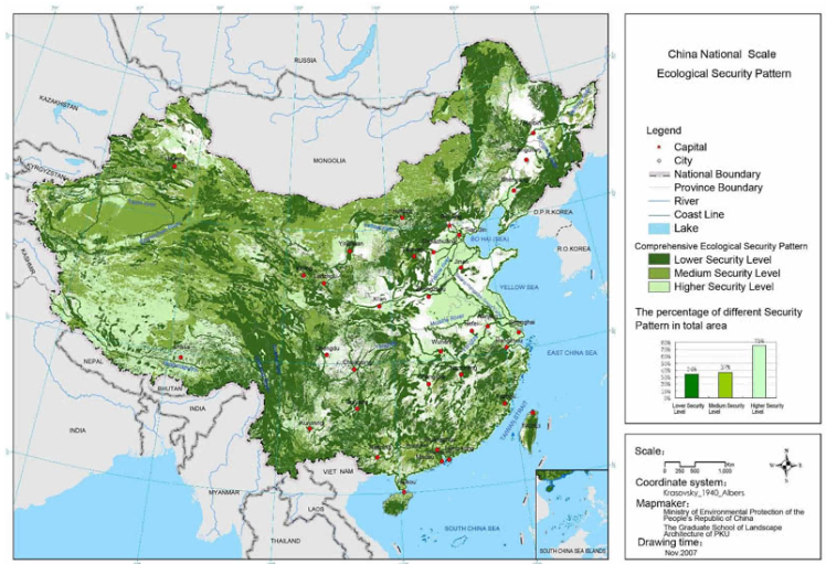 National Ecologial Security Pattern Plan. This Plan identifies critical strategic landscape structures for safeguarding natural, biological, cultural, and recreational processes, thus securing a wide range of ecosystems services essential for sustaining human society (China, 2007). Photo: Courtesy of Kongjian Yu
