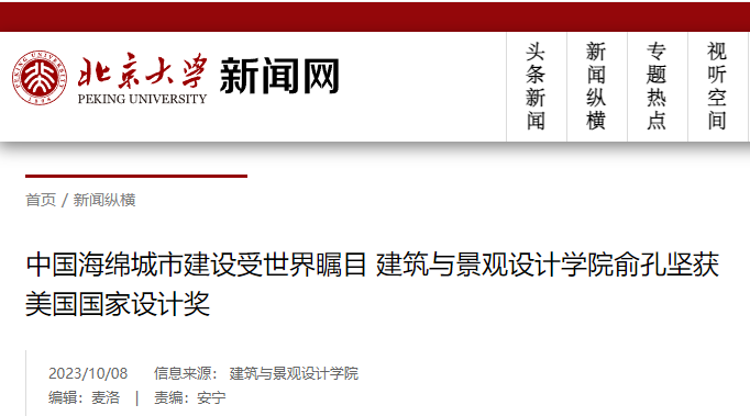 10月2~7日,在由库珀·休伊特-史密森尼国家设计博物馆(Cooper Hewitt, Smithsonian Design Museum)主办的美国“国家设计周”上,北京大学建筑与景观设计学院院长俞孔坚教授荣获风景园林国家设计奖(National Design Awards for Landscape Architecture)。作为中国海绵城市建设实践及学术研究的杰出代表,俞孔坚获得这一奖项,标志着中国海绵城市建设成就受到世界瞩目。