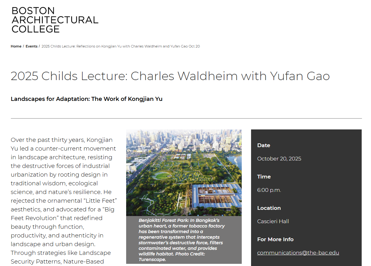 2025年10月20日,波士顿建筑学院举办了纪念讲座,主题为“适应性景观:俞孔坚的作品”,由哈佛大学设计研究生院景观建筑学约翰·E·欧文教授Charles Waldheim与BAC景观建筑学系核心教师Yufan Gao共同主讲。在过去三十年中,俞孔坚教授领导了一场景观建筑领域的反思运动,抵制工业城市化的破坏性力量,倡导将设计根植于传统智慧、生态科学和自然的韧性之中。他摒弃了装饰性的“小脚美学”,提倡“大脚革命”,通过功能性、生产力和真实性重新定义景观和城市设计中的美学。俞教授的代表性策略包括“景观安全模式”、“基于自然的解决方案”和“海绵城市/地球”,旨在塑造能够修复地球而非破坏地球的城市系统。此次讲座不仅回顾了俞孔坚教授的生平与成就,还探讨了他对全球生态城市主义的深远影响,以及他如何通过设计实践推动环境修复与社会变革。