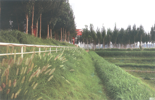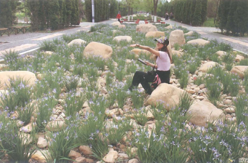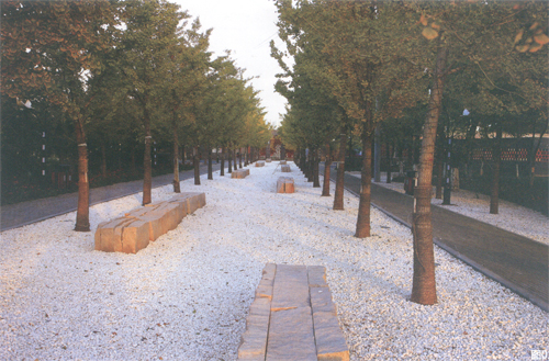 设计尊重场地原有地形和植被。游客所见之滨河林带、池塘及园中的老枣树、剌槐、杨树,乃至成斤的幼林,皆为场地苗圃遗物,在设计施工时巧妙护留。场地原有部分道路也得以保留,包括园中的南北直线主干道路。使建园工程投资少,见效快,且留下了场地的记忆。在此基础上,叠加新的设计。整体设计从材料、色彩、植物种类和构景设计手法诸方面,彰显当代而中国的特色。