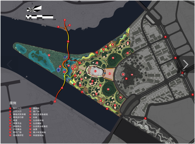 (3)文化弹性:从当地富有历史和文化意味的“板凳龙”传统舞龙习俗中获得灵感,设计一条富有动感、与洪水相适应的步行桥,将被河流分割的两岸城市联接在一起,实现了景观的文化弹性。