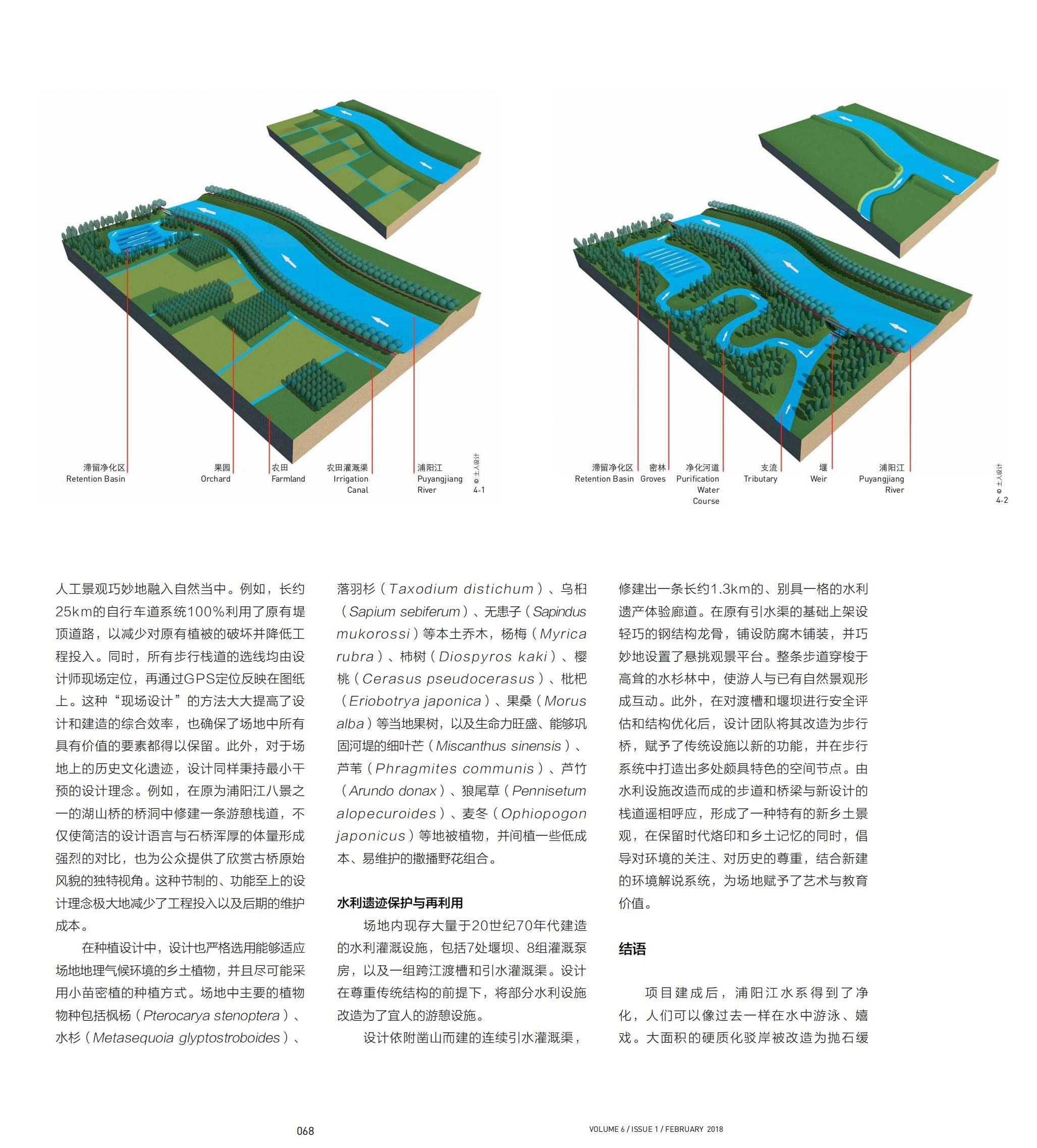 As a pilot project of water treatment in Zhejiang Province,the Puyangjiang River Corridor project has remediated the polluted river course into a popular ecological and recreational corridor. The project restored the aquatic ecosystems and improved the water quality by introducing a constructed wetland system which purifies the irrigation water and the tributaries of Puyangjiang River. Under a concept of Sponge City construction and a minimal intervention strategy, the design not only enhances the flood resilience,but also minimizes the disturbance to natural ecosystems of the site.In addition,the existing agricultural, water-conservational, and cultural heritages have been preserved and partly reused as recreational structures and facilities, contributing aesthetic and educational values to the site.