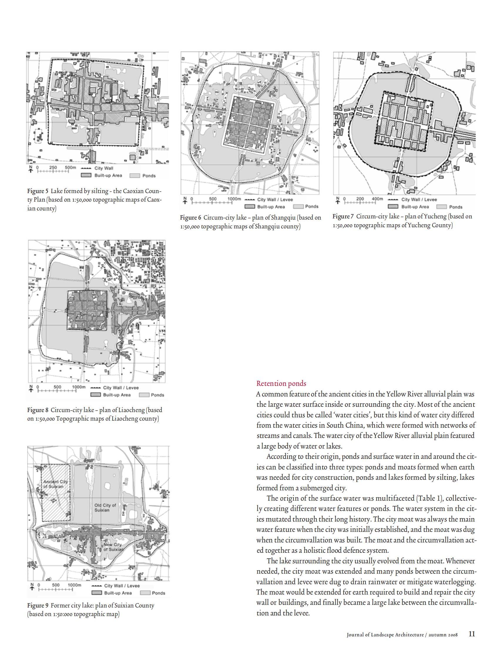 This paper is a report on a researchproject. It shows how the past expe-rience of adaptive strategies that have evolved in the long history of sur-vival under hazardous conditions isinspiring for us in facing future un-certainty. Based on a study of several ancient cities in the Yellow River floodplain,this paper discusses the disastrous experience of floods and waterlogging and finds three major adaptive landscape strategies: siting on high ground,constructing wallsand protective dikes,and reserving or digging ponds within cities.Theseadaptive strategies create three types of water city: water-within-city, city-in-water, and ying-yang-city. It is argued that all these traditional experiences and landscape heritages help us to understand the vernacular cultural landscape of cities in the Yellow River floodplain, and that they have important value for landscape archi-tecture and urban planning as universally applicable strategies in facing global warming and regional climate change as well as practical land-scape strategies for better urban design in this region.It is further argued that the water-adaptive landscapesare valuable features of the cultural heritage, and should be integrated into landscape and urban planning for urban development today.