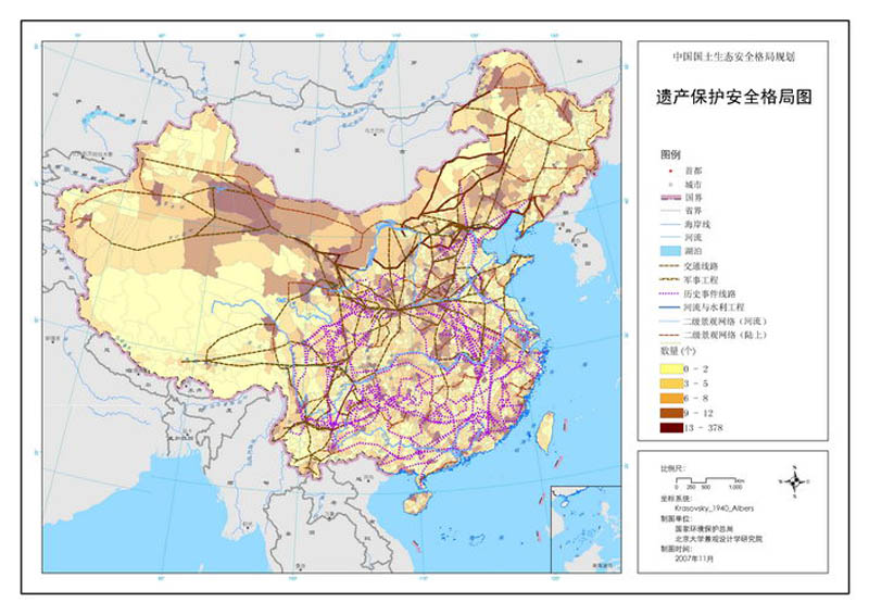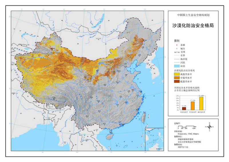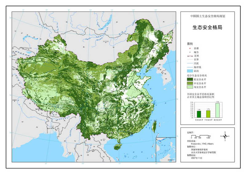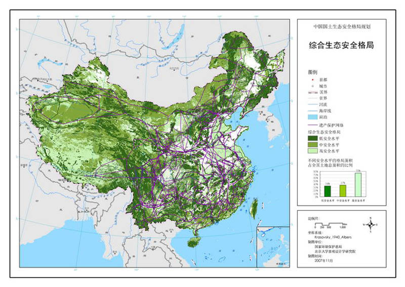 在此基础上叠加、综合,确立国土生态安全格局的最终成果。研究结果表明,低安全水平生态安全格局总面积占到我国陆地总面积的34%,中安全水平生态安全格局总面积占我国陆地总面积的37%,高安全水平生态安全格局占我国陆地总面积的75%。本研究将为国土与区域尺度土地利用规划和生态安全格局规划提供系统的指导,并为正在开展的全国和地区的主体功能区规划工作提供初步的借鉴。