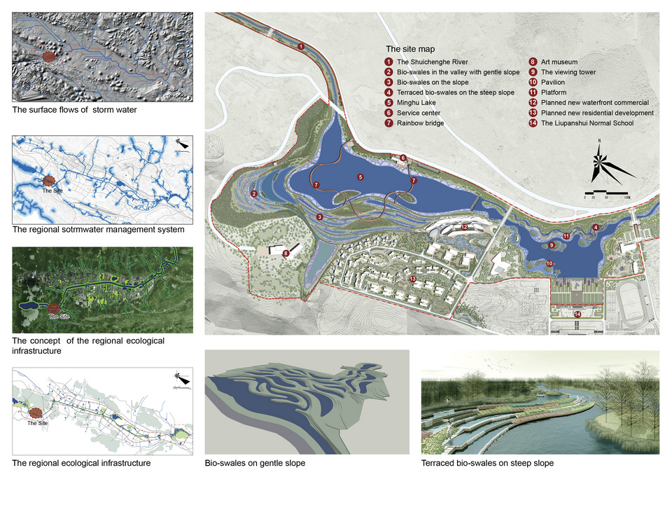 根据上述宏观格局构建及中观综合规划设计策略,针对河段性质、河道条件、河岸周边地形与土地覆被等用地适宜性分析定位具体生态设计方式。建成实例河段位于水城河上游,一线天水系与水城河汇水处。工程被称为明湖湿地公园,已于2012年4月29日建成开园,2013年10月8日,正式通过国家林业局试点验收,正式为贵州省第一个获得正式授牌的AAAA级国家湿地公园。原来的河道两岸的水泥防洪堤,排洪管道,以及水污染都不见了,现在变成了一条生机勃勃的湿地公园。2014年,该项目获得全美景观设计师协会(ASLA)年度设计荣誉奖,评委们对该项目的评价:“设计师运用一系列再生设计技术,特别是采用技术降低水流速度,将渠化的河道以及生态环境日益恶化的城郊地区改造成一座全国著 名的湿地公园。该公园充分发挥了河道景观作为城市生态基础设施综合的生态系统服务功能,包括雨洪调蓄、水体净化以及自然栖息 地的修复。同时公园还为市民聚会赏景提供了一个宝贵的公共空间”。