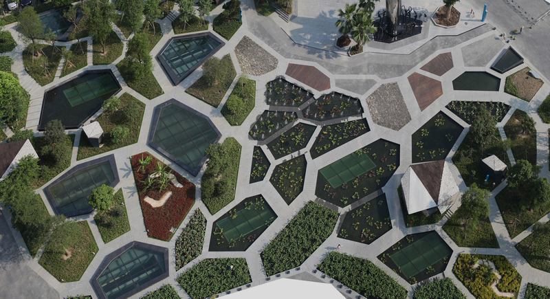 阡陌交通的栈桥和道路将用地分割成大小不等、形态各异的几何体——或下沉为水景,或上浮为种植乡土林木的小丘,或成为区域小广场(庭院),或是地下室采光天井。并在其上点缀以乡土材料建造的现代景观构筑,以形态和乡土材料组合解决高起的若干地下室采光天井的视觉问题,贯穿、延续地域景观。用栈桥、道路、水景与庭院等实际功能体块勾勒出“桑基鱼塘”的网状肌理,让人体验到的不仅是肌理间生动丰富的功能联系,还有亲切舒缓的基塘肌理带给人的仿佛当年人对土地的归属感。水景在场地中被分作生态湿地以及地下室采光天井上的薄水之用,其重点不在于再现水景的不同形式,也不在于水景带来的若干亲水活动,而是在于对区域文化、生活及当地自然环境关系的尊重。生态湿地以及地下室采光天井上的薄水皆设计为雨水、污水收集处理系统的一部分。把屋面和露天雨水收集、处理、蓄积在景观水池之中,将产生的中水和污水全部回收,通过生态湿地进行生物降解处理,回用于绿化灌溉和补充景观水池水量,不使用饮用水作为景观用水。水景设计也解释了我们面对今天环境现状所做出的选择——如何延续和存在。
