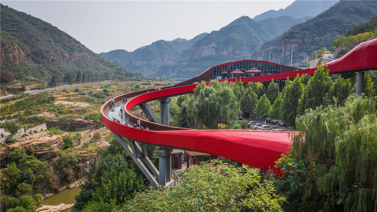 红旗渠上的“太行天梯”用充满豪情的红色浪漫主义手法,在非常局促和复杂的地形中,用一条蜿蜒盘旋的空中步道,巧妙地解决了人流交通、车流组织、空间体验、科普教育和景观保护等一系列挑战,用最少的干预和当代的语言,在尊重红旗渠伟大精神和壮丽景观的同时,阐释了新时代的红旗精神。