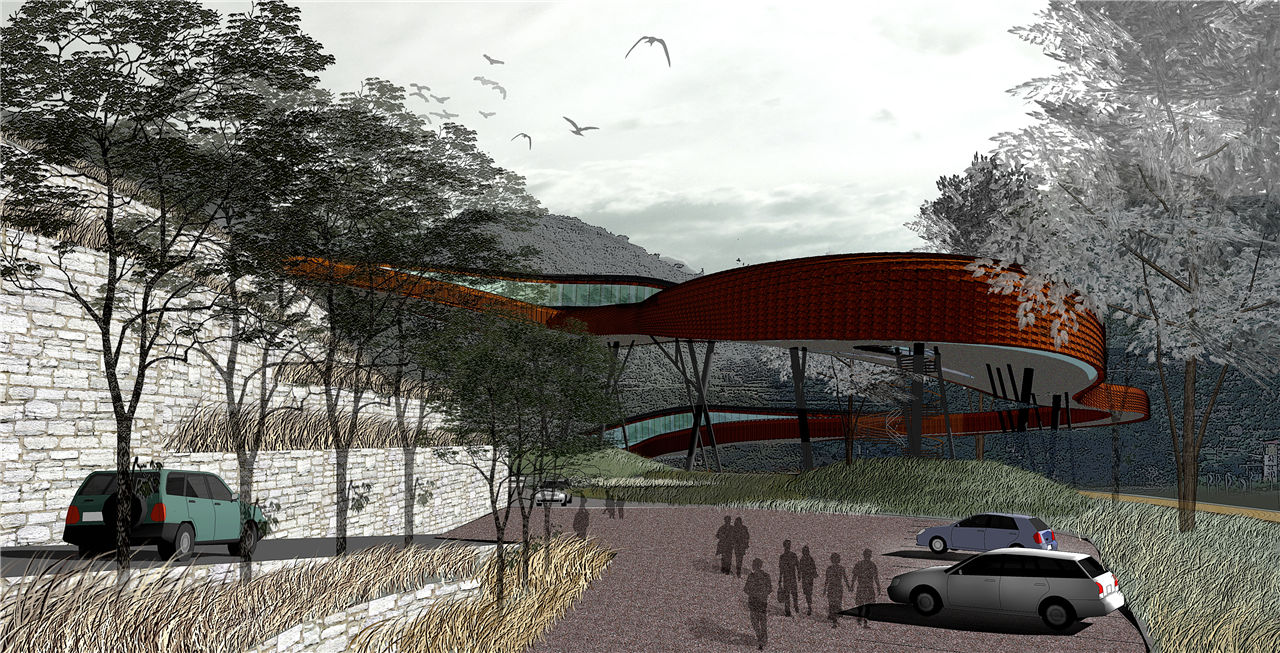 整个坡形建筑处于风景区入口停车场之上,最大限度地留出有限的地面空间作为停车使用;同时坡形建筑横跨了一条省级公路,使得进入景区的流线得以与过境机动车分离。