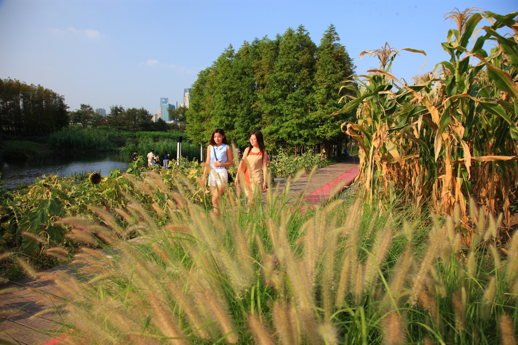 由于富营养是黄埔江水的主要特征,生产性作物也被大量在公园中轮作,以用于营养物的吸收,生产的过程就是水净化过程。水生植物的生物体是很好的饲料和肥料,在检验没有重金属污染后,可作为饲料.如果有重金属污染,则可作为纤维植物的肥料。芦苇则是很好的造纸材料和建筑材料、燃料等等。收割是净化湿地系统不可或缺的组成部分,以避免二次污染。