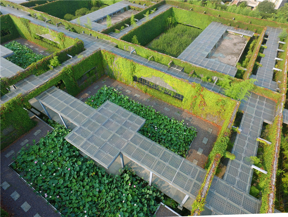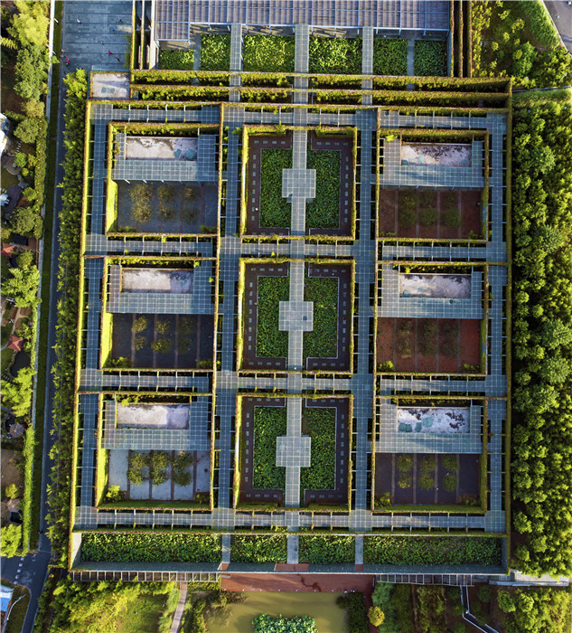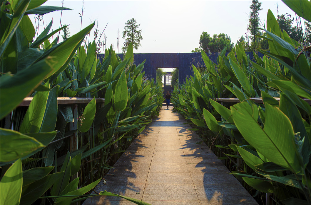 场地内布置了一个狭长的幽谷空间,通过梯地台田巧妙地解决了防洪问题的同时,启承开合,委婉流动,长近1公里,其间设计了一系列景观盒、亲水栈桥、平台和穿梭于植被中的步道网络。始于南端的风车提水和层层梯田,而止于北端的九宫格,游走其间,或潜谷底探水,青蛙绕足;或上坦荡田野,荷叶田田;或穿梭院墙,庭院深深。