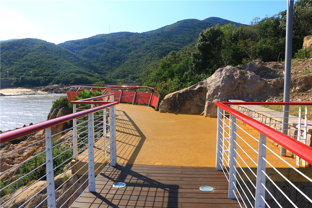 4)材料选择:当地盐碱性较大,在材料的选择上也要选择一些耐腐蚀的材料,防止空气腐蚀较大对设备造成损坏。场地内除植被的绿色和岩石的黄色外,其他比较灰暗,因此在栈道本身的设计上选择了比较突出的红色栏杆,以及淡黄色的透水混凝土面层。而透水混凝土作为栈道的面层材料也解决了雨天积水的问题。