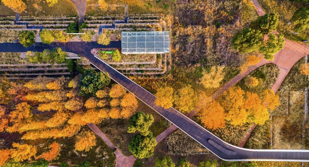 构建曲折有致、高低错落的多层次道路系统。空中栈桥、自行车道、步行栈道、田间小路等共同构成公园的立体慢行网络,游客置身其中,曲径通幽,移步异景。