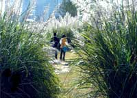 are massed along the riverbank and throughout the design
