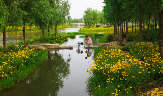 ∆ 2007年建成的天津桥园:城市海绵系统,收集雨水并用于棕地的生态修复(Yu,2010 )